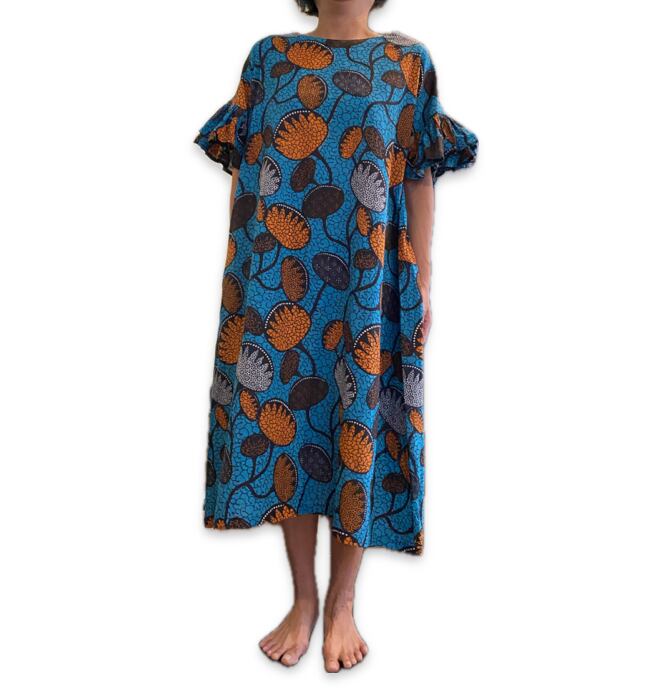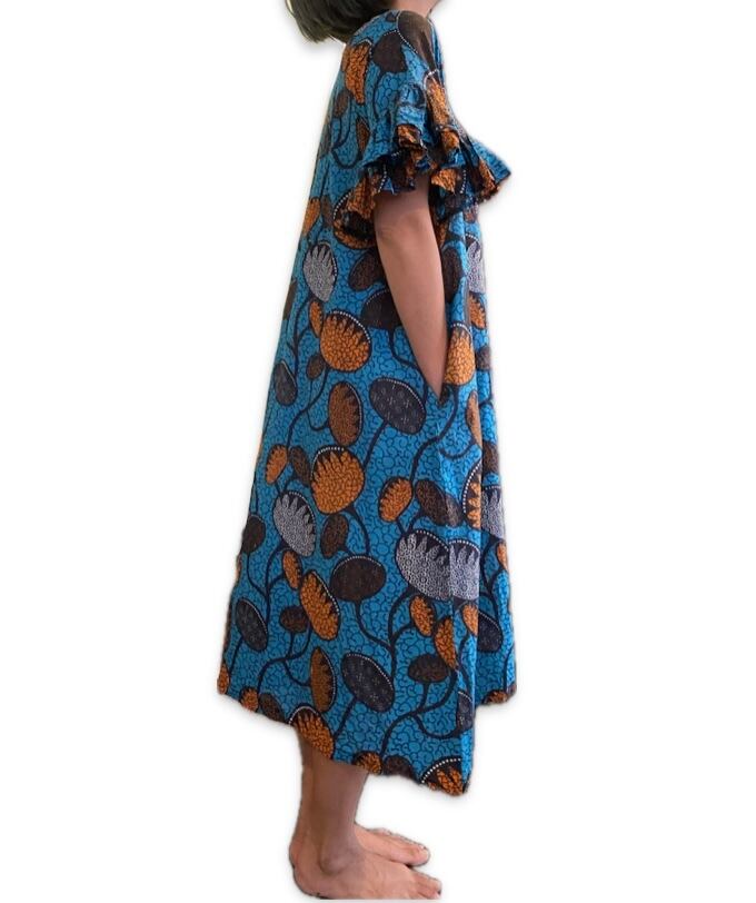 アフリカンプリント 蓮の実柄フリル袖ワンピース