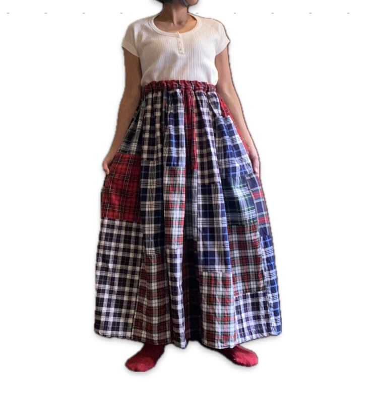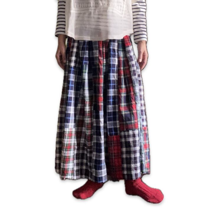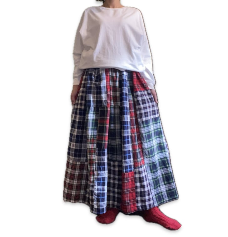 ■先染めチェックの魅力を楽しむパッチワークロングスカート